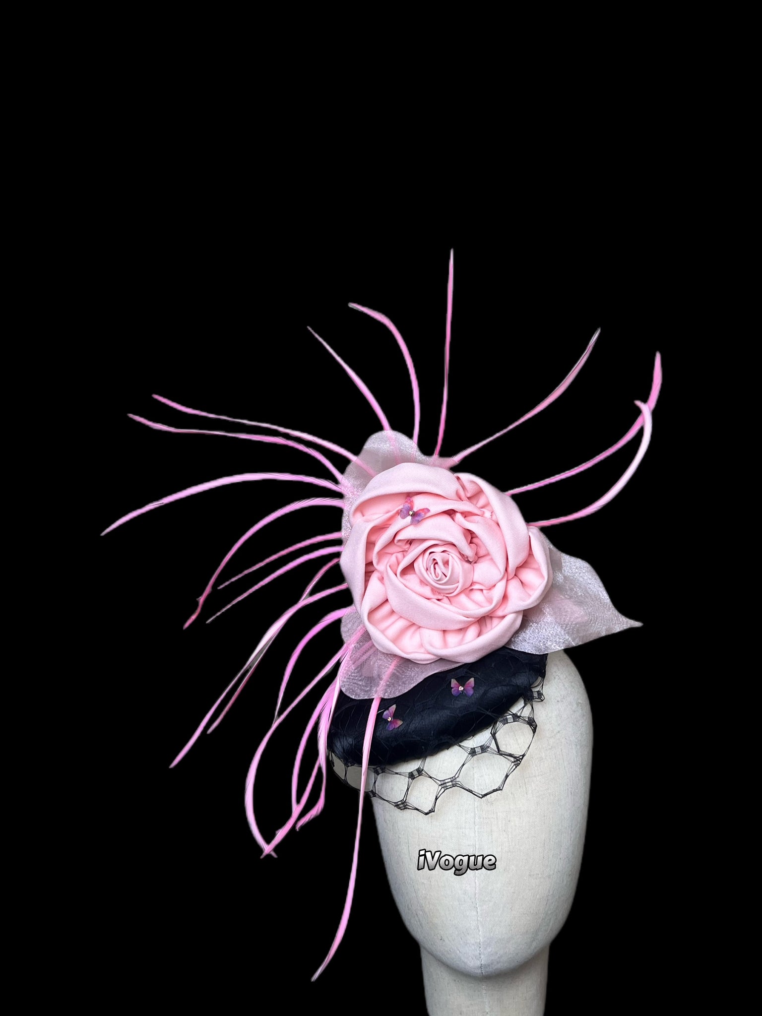 • Load image into Gallery viewer, Black fascinator button veils cover and pink flower matching dress