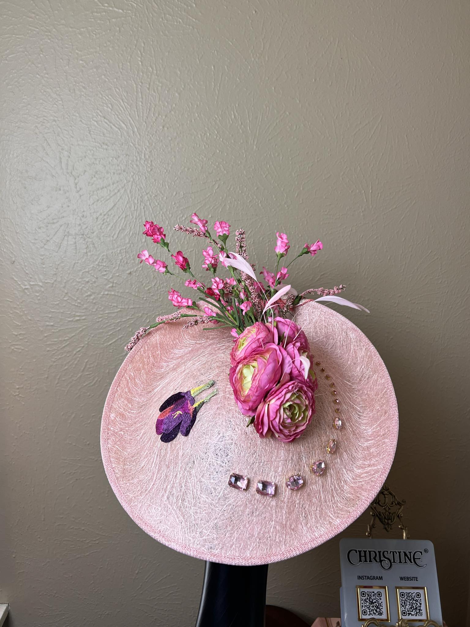 Designed it with Rhinestone around the brim, flowers on one side to match the dress in our shop.