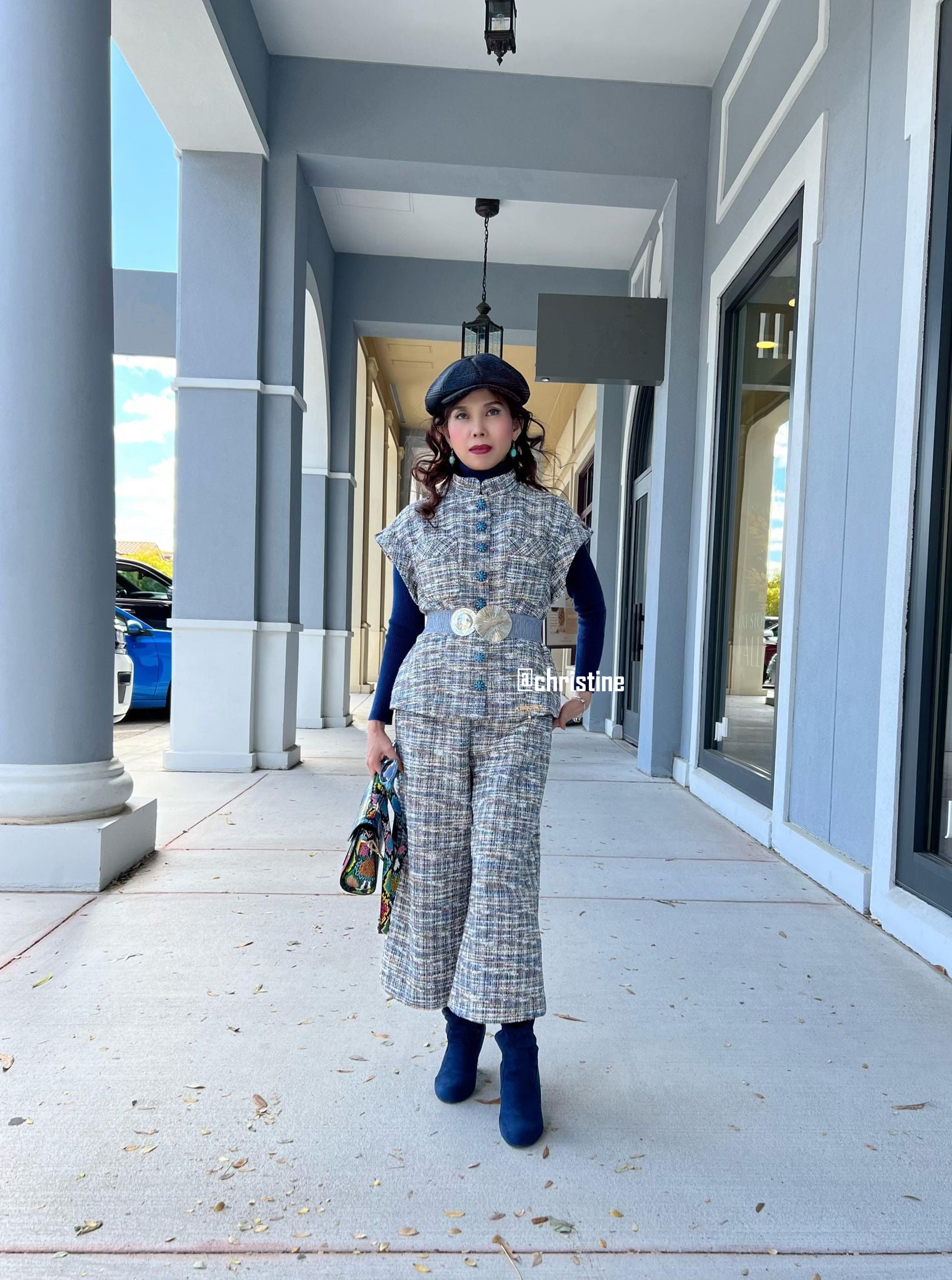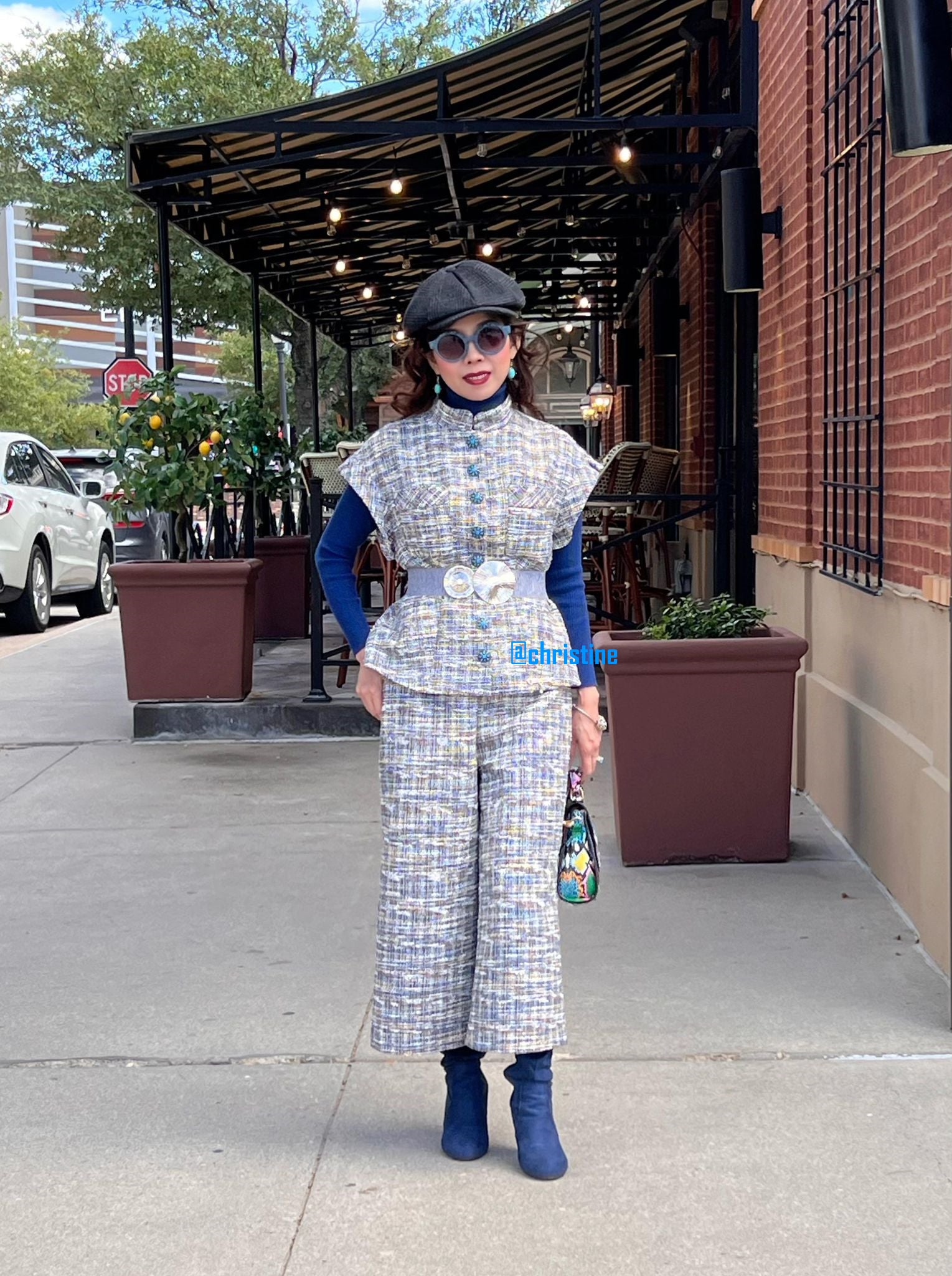 Kennedy set trendy Fall style. Short pants are the highlight 30". You can style it in Spring without Turtleneck. Turtleneck isn't included.