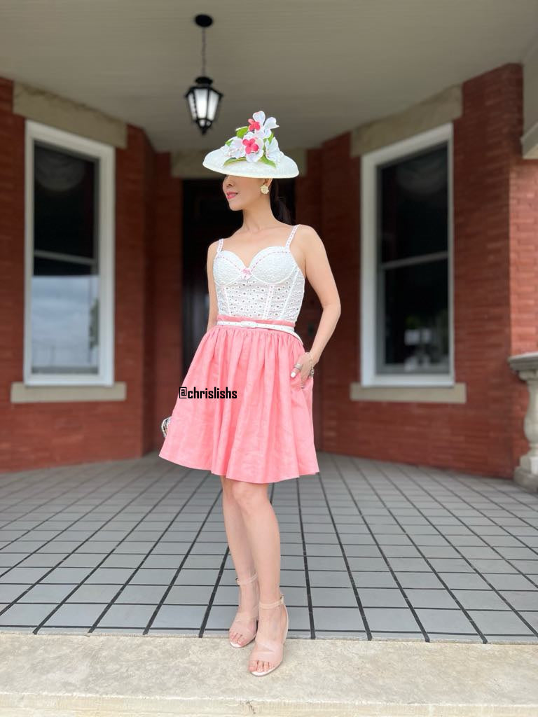 Corset top in white/pink Ruban and blue or full set pink skirt/white skirt. Skirt in linen, lined silk.